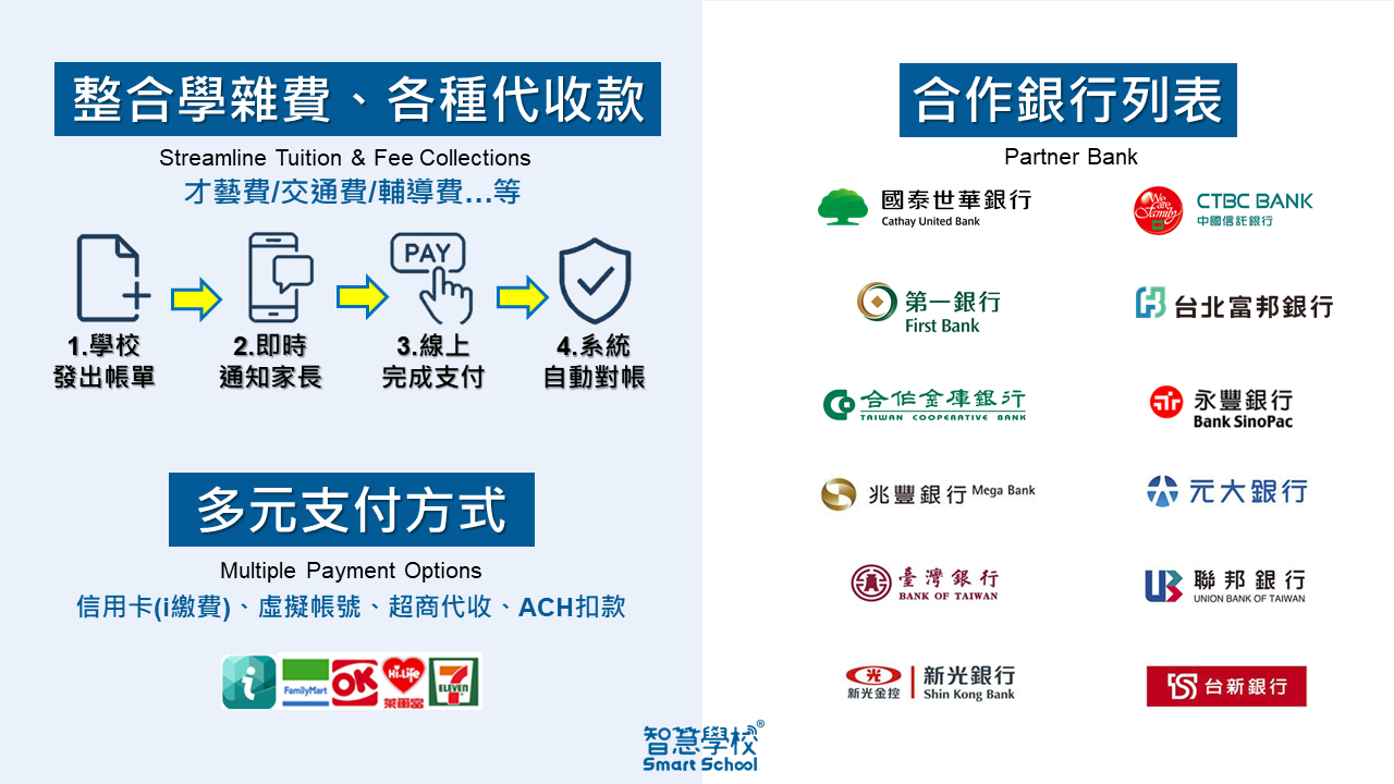 - 1 全通路支付:支援信用卡、虛擬帳號、四大超商及 ACH 扣款,給家長最便利的選擇。
